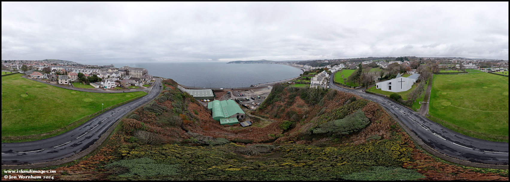 A low level 360 degree panorama form overhead the inlet that was filled in for the construction of the Manx Electric Railway's depot, power station and workshops.