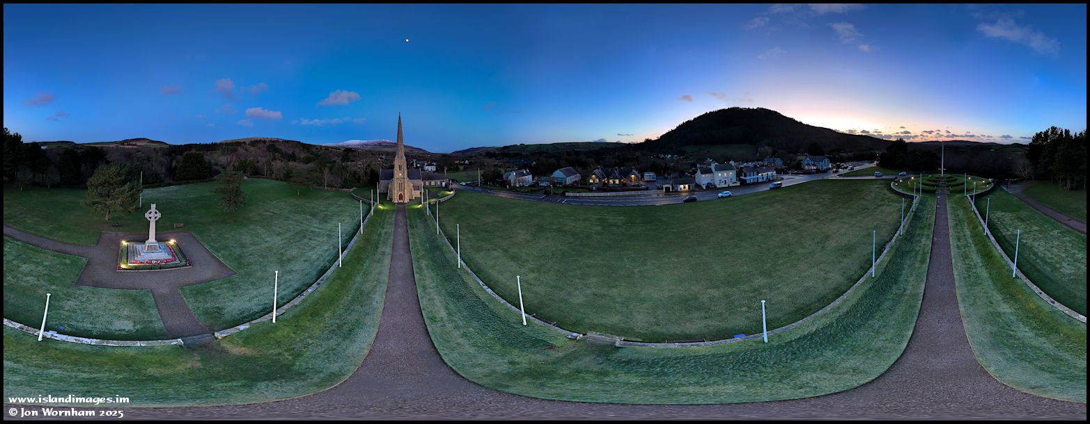 360 degree panorama of St John's Church and Tynwald Hill at dusk.