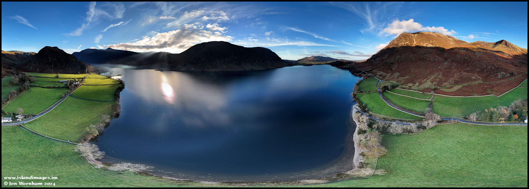 360 degree panorama at Crummock Water, with the sun about to dip behind the mountains.