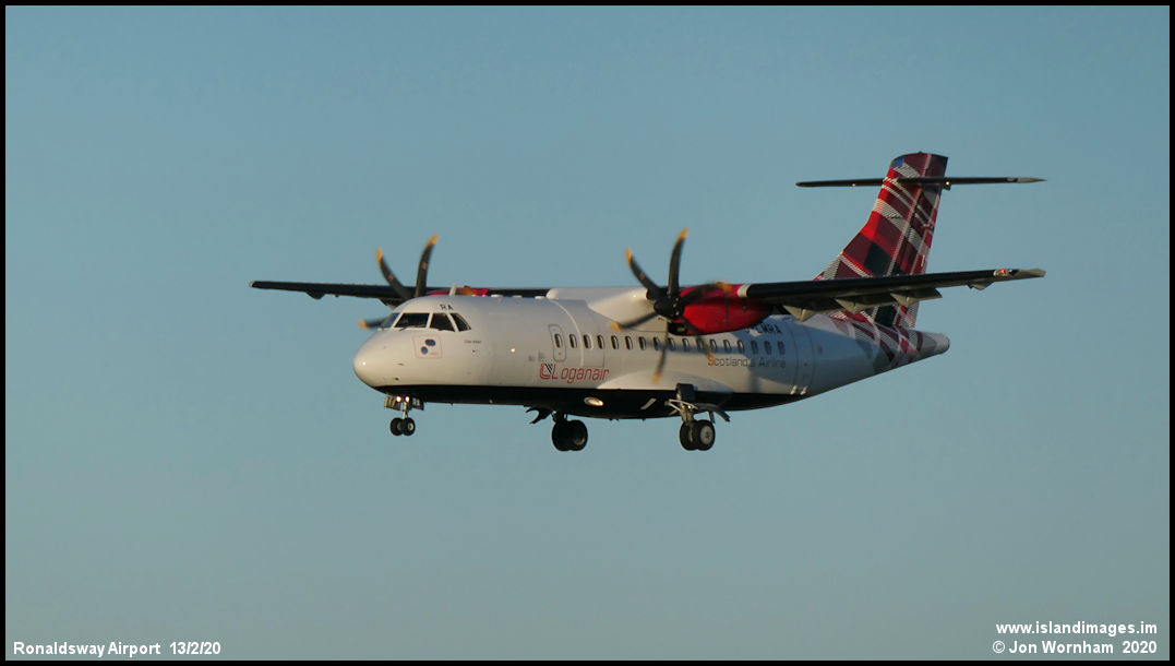 Loganair ATR42-500 G-LMRA on final approach to runway 26 at Ronaldsway, arriving from London City airport operating a BA Cityflyer service.
