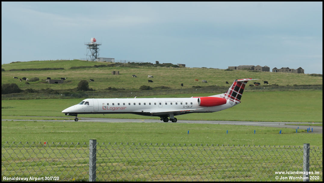 Loganair ERJ145 G-SAJF rolling on runway 26 with the current (2011) and Royal Navy 1944 radar sites on the hill behind.