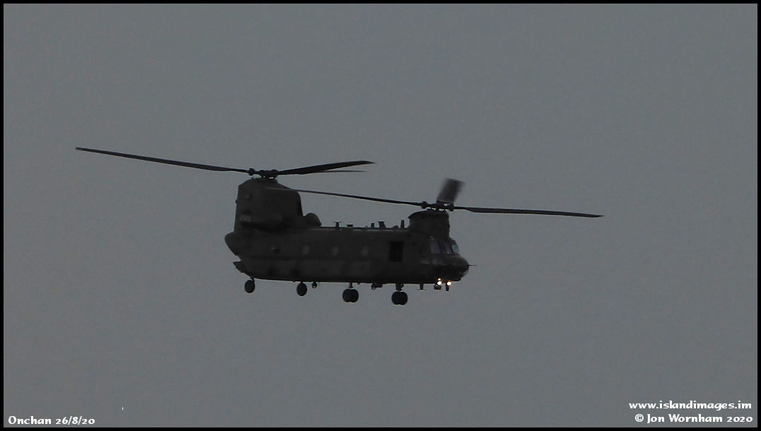 RAF Chinook ZA704 again, in some gloomy conditions, now outbound from the hospital landing site on the next leg of its training mission.