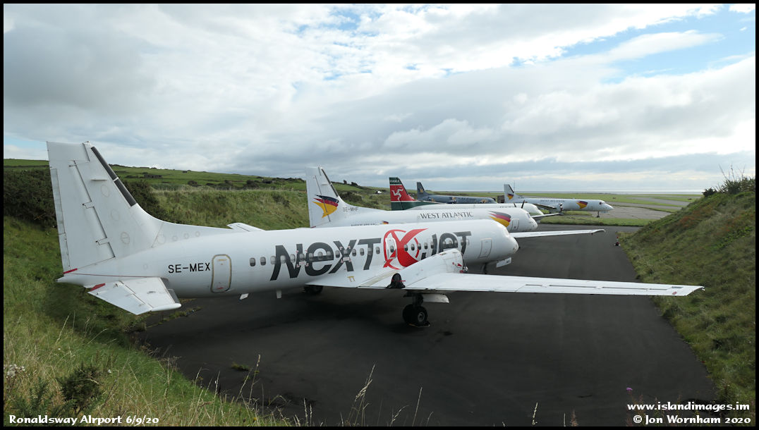 Looking across the remotely stored ATPs from the top of the bund that surrounds the one time engine testing area at Ronaldsway, with SE-MEX nearest.