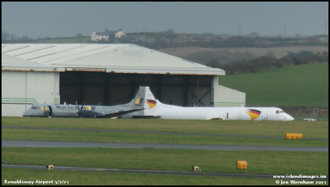 An across airfield shot of two ATPs outside the West Atlantic hanger. Grey liveried SE-MAO is in service and had been acrrying out engine tests, the white liveried one has been disidentified and had the wings removed, but is possibly SE-MHG.