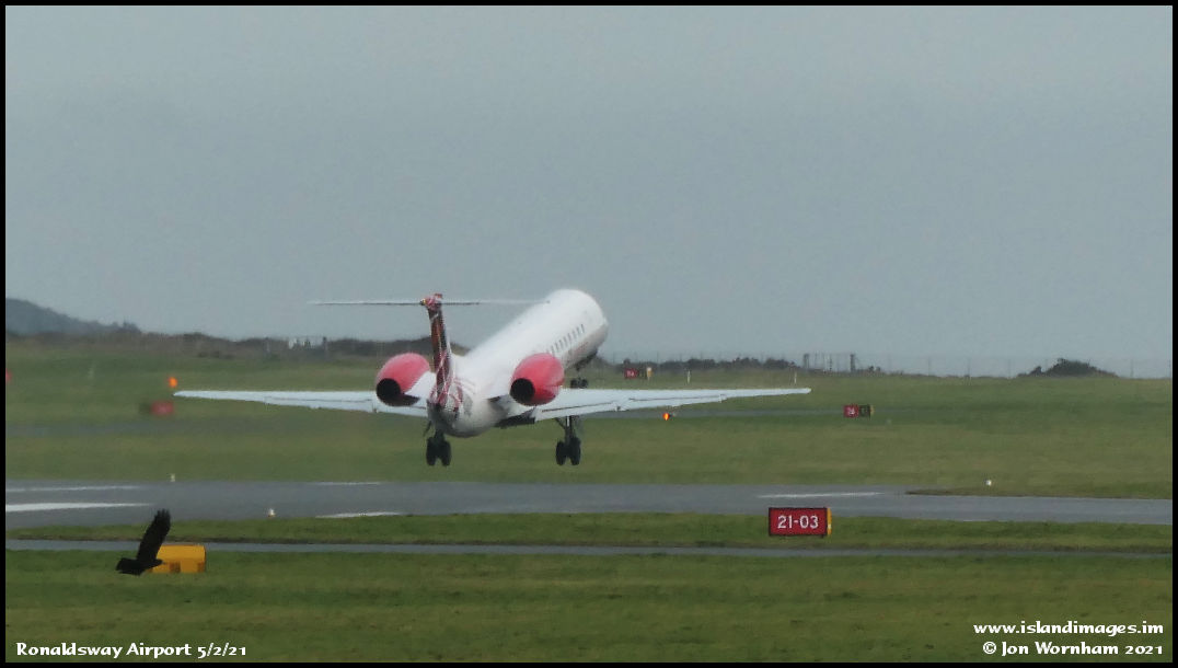 Loganair's G-JJ lifts off runway 08 and heads for Manchester.