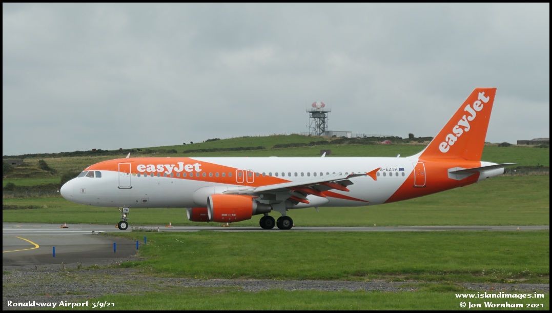 Easyjet Airbus A320 G-EZTH is backtracing the runway after landing due to major work in progress on the airfield. Ronaldsway's Selex primary radar scanner is on the hill behind.