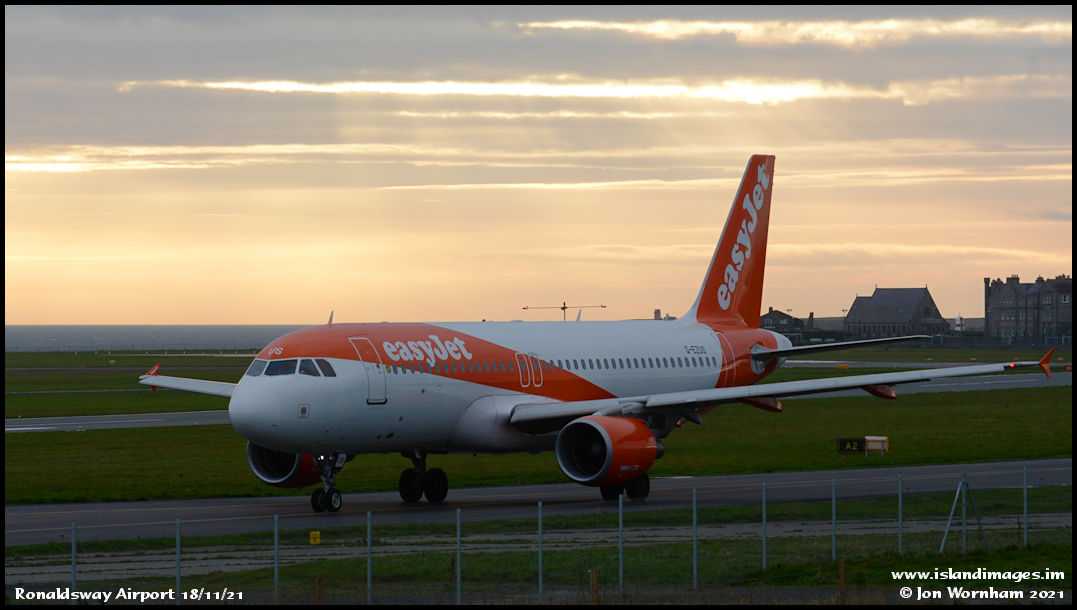 I've moved to the other side of the runway now, intime to catch EasyJet Airbus A320 G-EZUS taxiing for departure to Liverpool against a sunset sky.