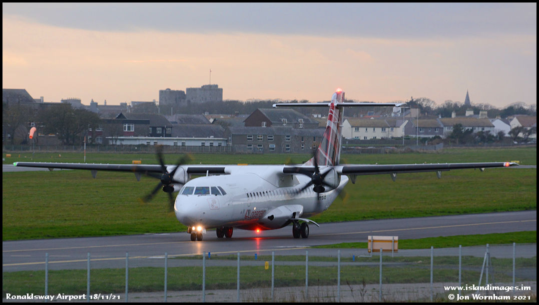 With Castle Rushen as a backdrop, Loganair ATR72 G-FBXB taxies out for departure to Manchester.