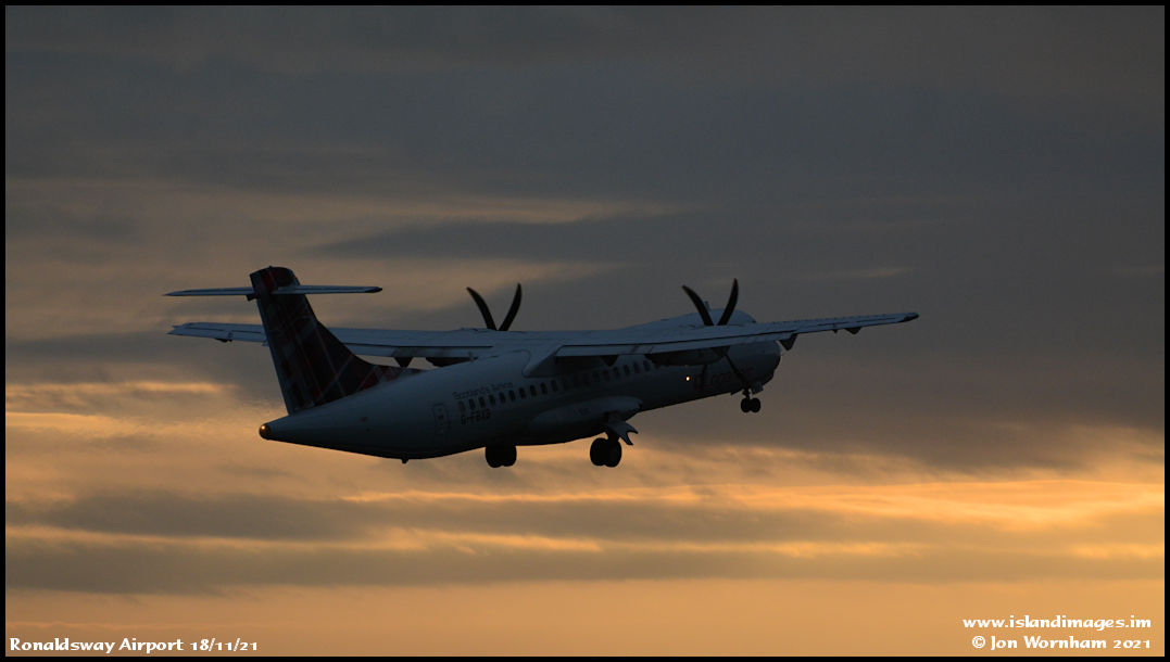 Loganair ATR72 G-FBXB climbs a way into a sunset sky.