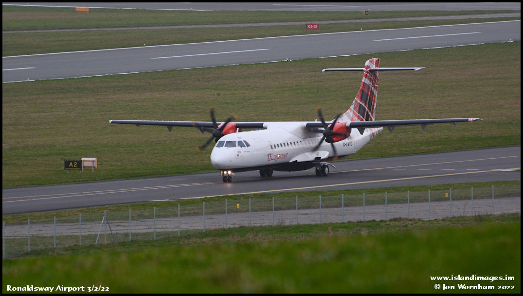 Loganair ATR72 G-LMTC taxies for departure from runway 26, operating the LOG697 service to Manchester.