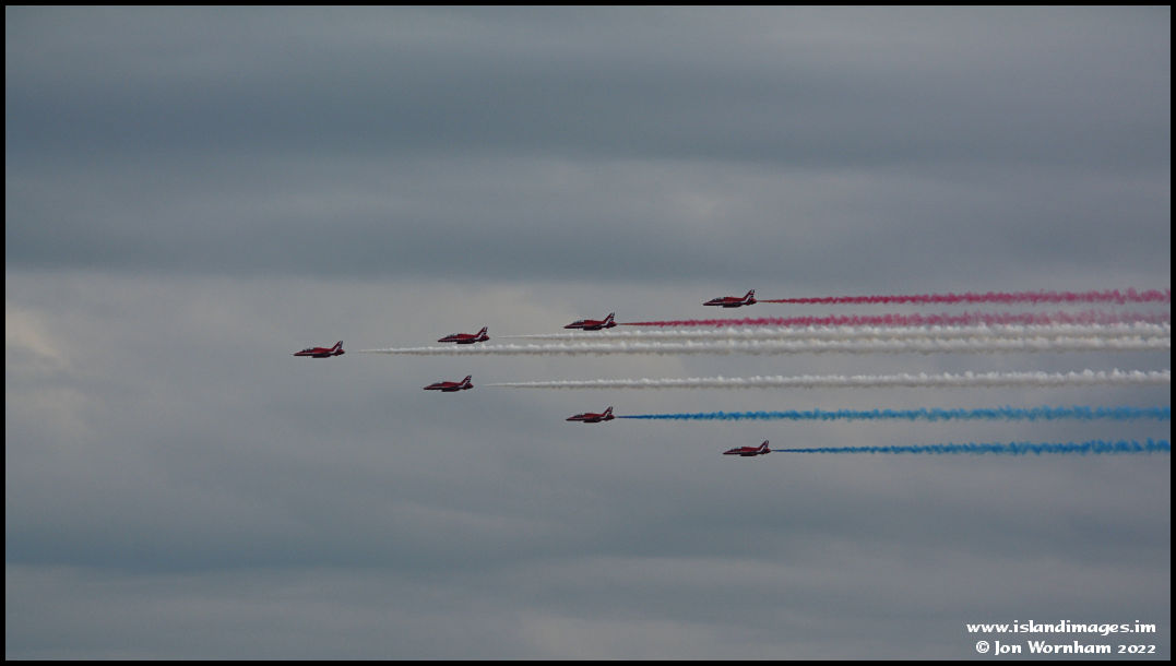 The RAF Red Arrows team run in for their 2022 display at Douglas, their first here since 2019.  This year, due to a problem during workup, there are only seven aircraft, instead of the usual nine.