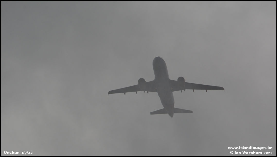 'Shadow in the Clouds' - EasyJet Airbus A319 G-EZDM passing over Onchan, being radar vectored downwind for runway 26 on 'Easy 175' a Belfast Aldergrove to Isle of Man flight.