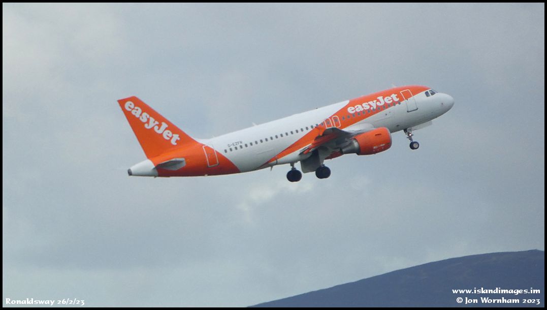 easyJet Airbus A319 G-EZFR climbs away from runway 08 at Ronaldsway.
