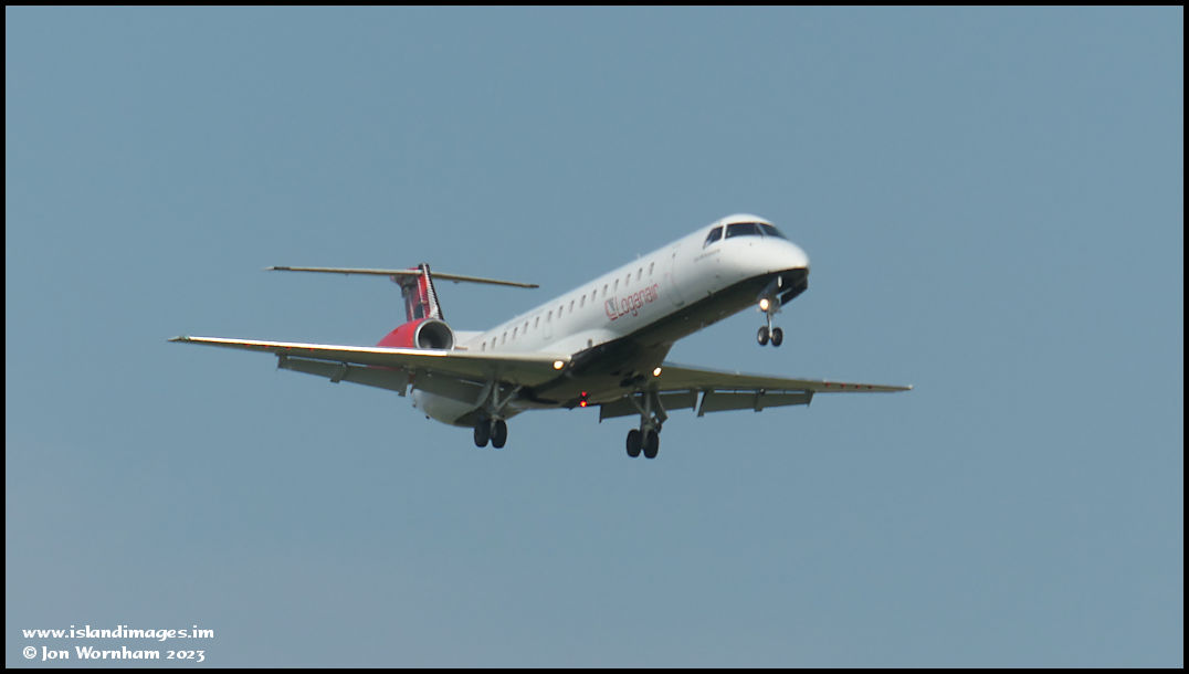 Loganair Embraer ERJ145 G-SAJN on final approach to runway 08 at Ronaldsway, operating a service from Birmingham.