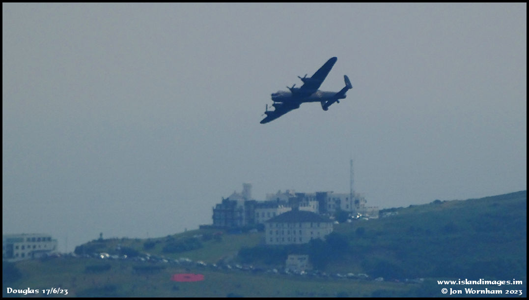 Avro Lancaster PA474 with Douglas Head as a backdrop. During WW2 the whole of the head was 'off limits' to civilians and home to the highly secret Royal Navy HMS Valkyrie radar establishment.