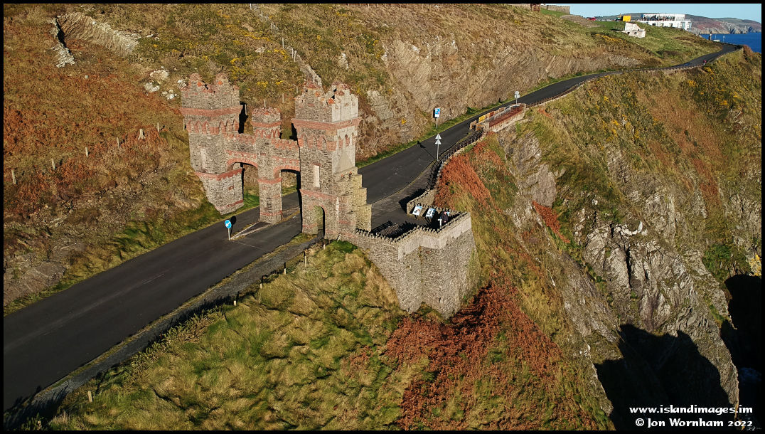 A lower level view of the archway. The gatekeeper's cottage was demolished in the 1950s and is now a viewing area complete with pedestal mounted binoculars. November 2019.