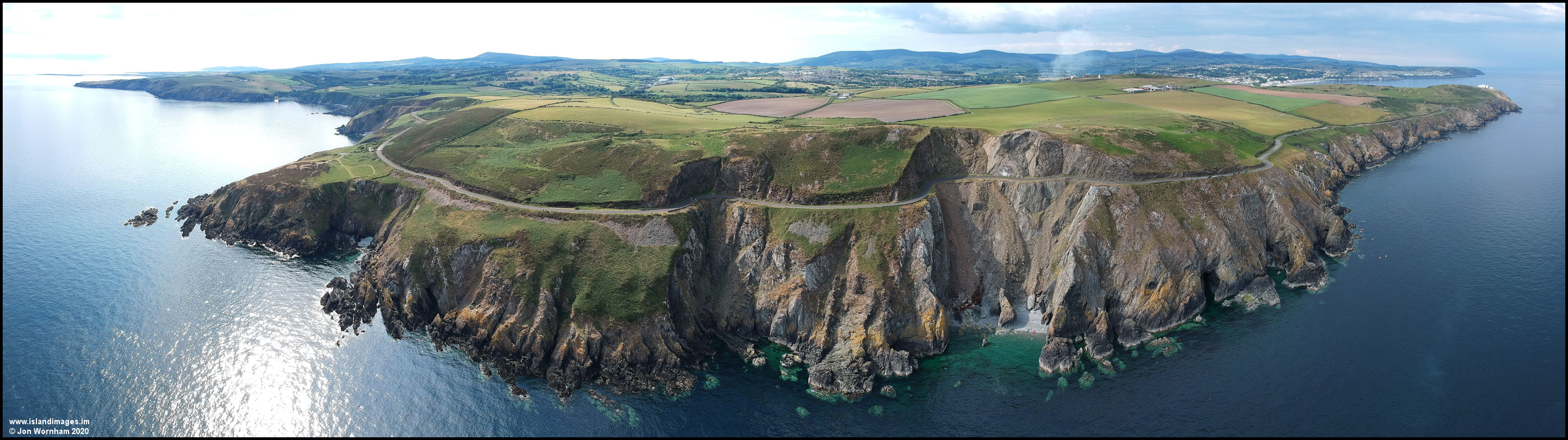 This panorama is centred on Port Wallberry and Horse Leap, but looking from Port Soderick on the left to Douglas Head on the right. For a sense of scale, can you spot the two kayaks pulled up on the Port Wallberry beach? June 2020.