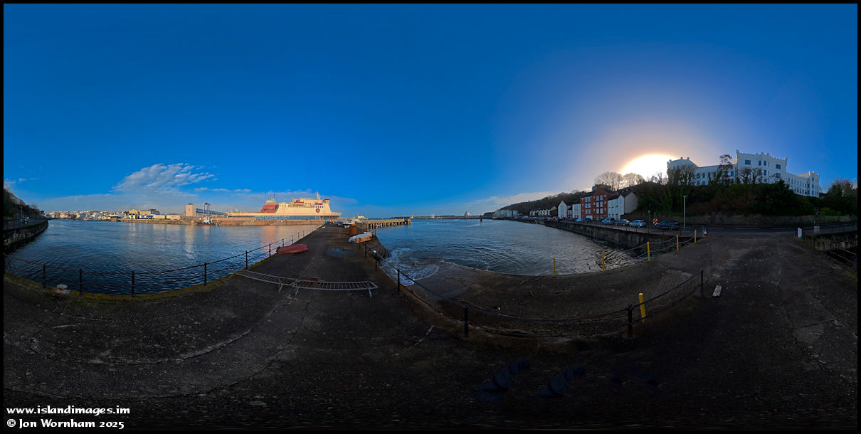Walking along the South Quay, I shot this panorama from the end of the Fort Anne Jetty. The time was 12:35 and the sun is still partially hidden behind the hill.