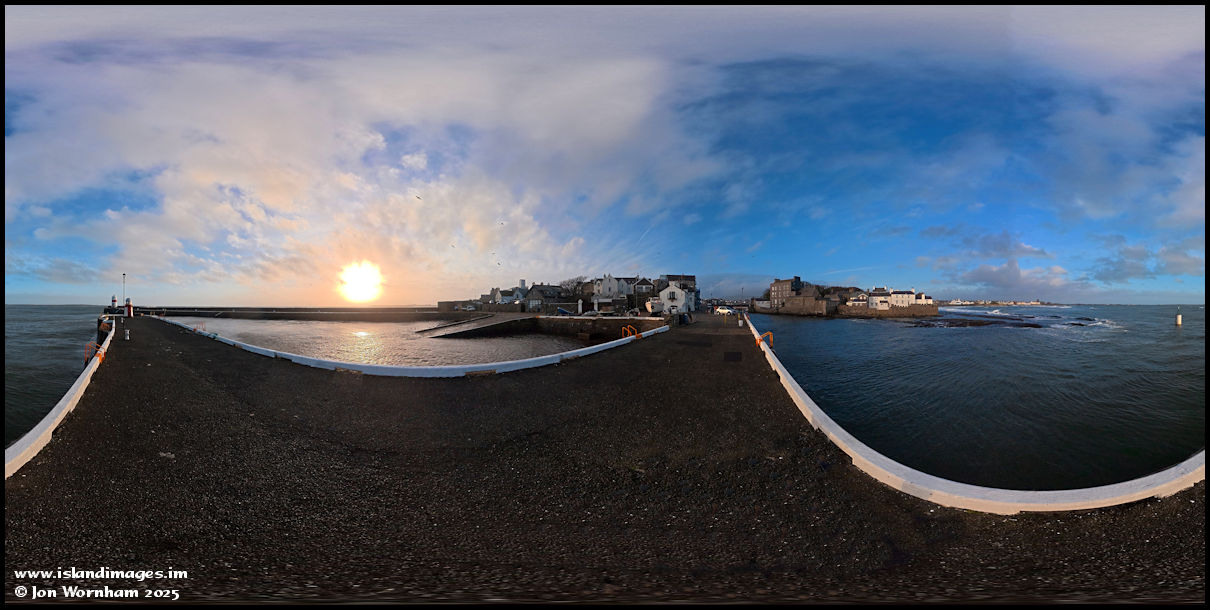 Shooting this first 360 panorama in Castletown on the short harbour breakwater. There were some big waves out there, some crashing over the longer breakwater, but you can't really see them here.