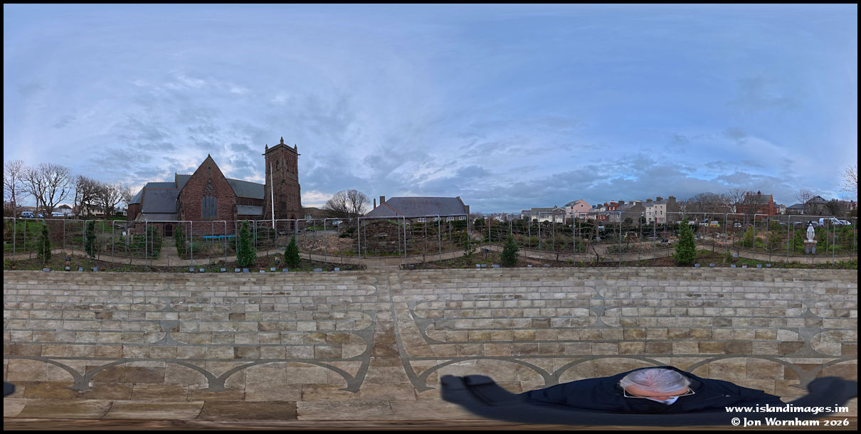 A 360 degree panorama in the cathedral gardens. In spring and summer it's a fascinating place to visit, with all sort of plants and flowers growing. The frames support the plants including fruiting apple trees.