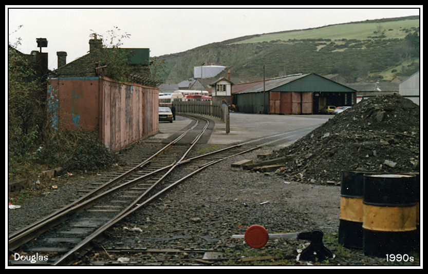 The approaches to Douglas Station, workshops on the left and carriage shed to the right