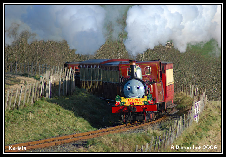 The 11:00 'Santa Special' headed around the curve at Keristal by No 12 Kissack, with Loch banking