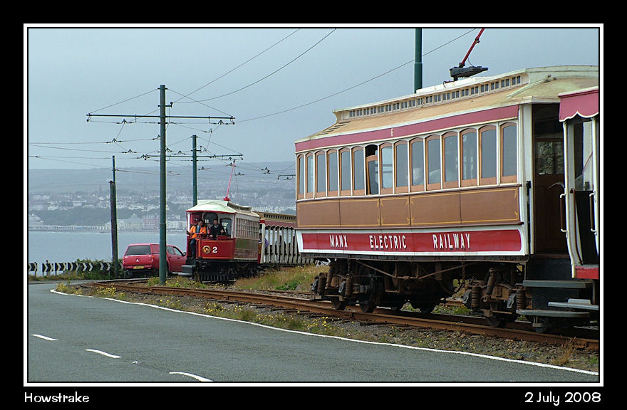 Trams passing on the headland with a misty Douglas behind, No 2 & No 5