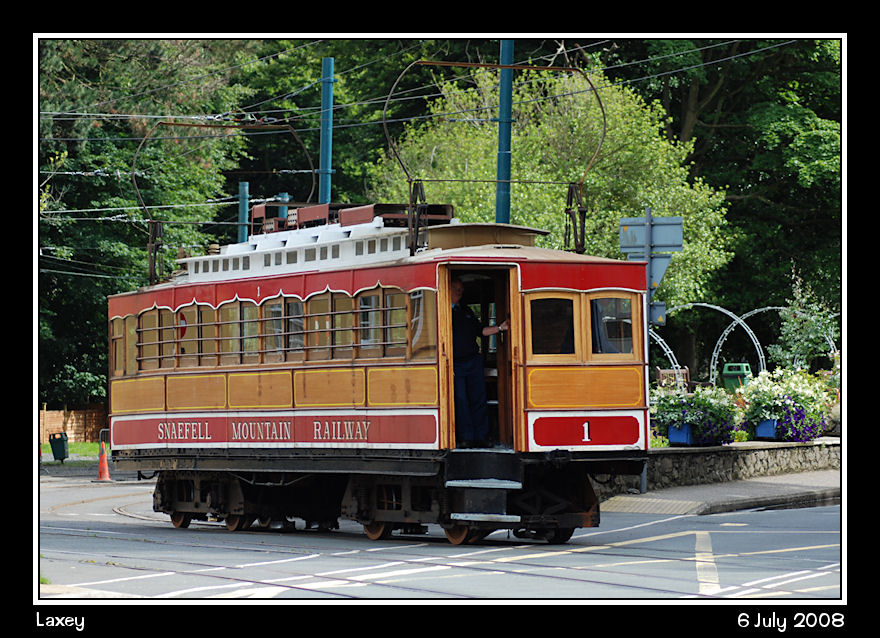 Snaefell Mountain Railway Car No 1 crosses the main road in Laxey