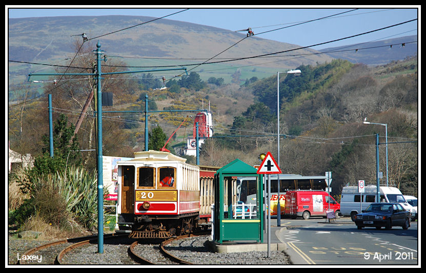 MER Car No 20 heads into Laxey with the Great Laxey Wheel as backdrop