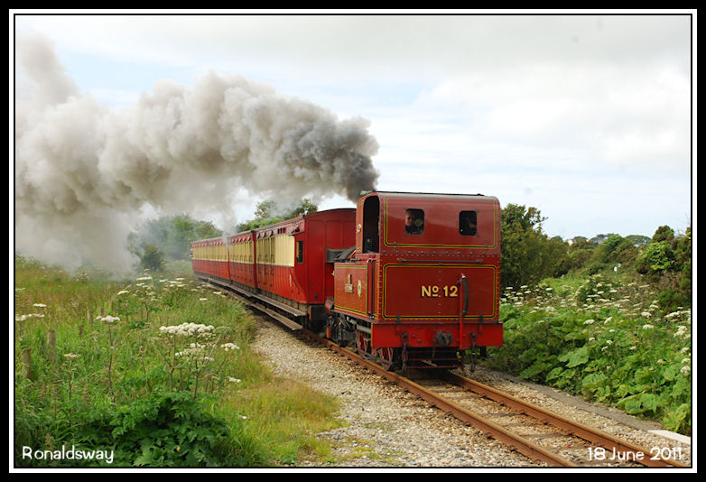 Running late and making lots of smoke due to inferior coal, No 12 'Hutchinson' approaches Ronaldsway halt