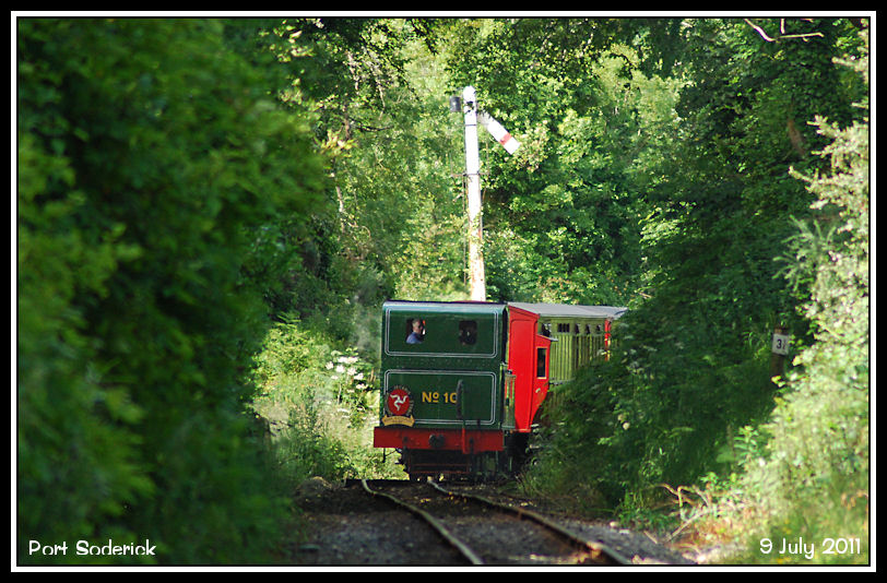 IOMR No 10 'G.H. Wood' emerges from Crogga Glen woodlands and approaches the station