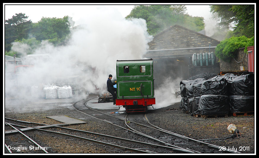 IOMR No 10 'G.H. Wood' comes off shed on a rather wet morning to work a special mixed train to Port Erin