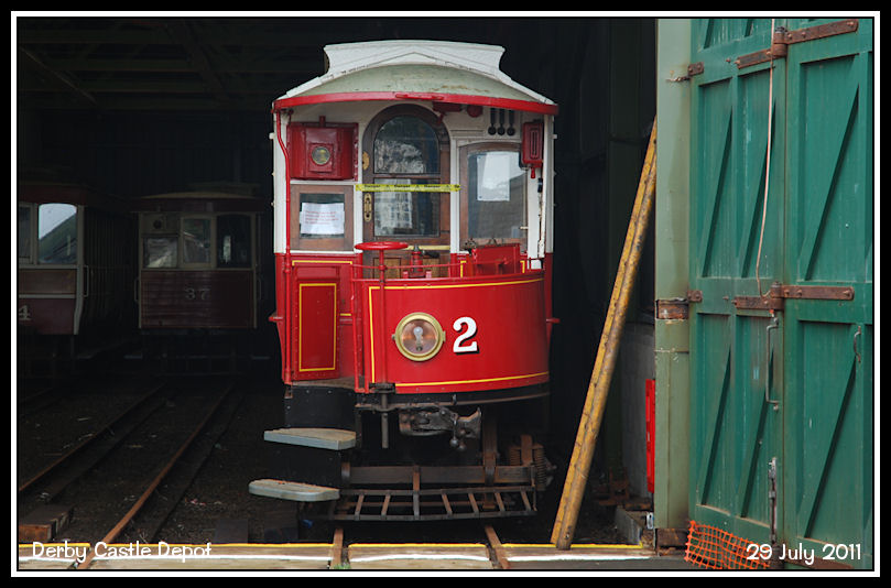 The other survivor of the three 1893 power cars, No 2, hides inside the running shed. No 3 was lost in the Laxey depot fire of 1930