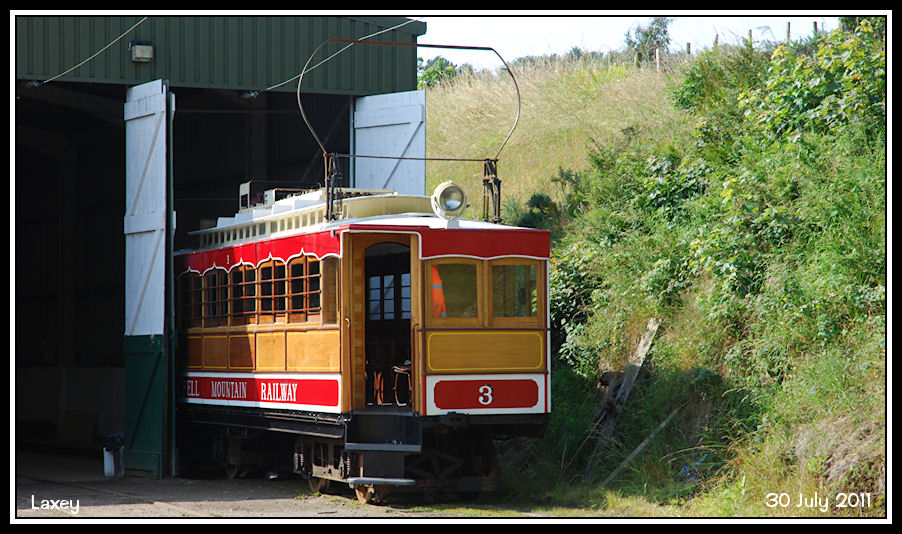 Up at the Snaefell car sheds, No 3 peeks out of the depot