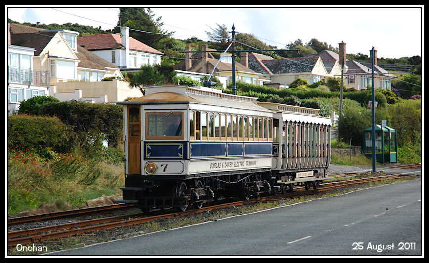 Manx Electric Railway blue liveried Car No 7 coasts down the hill into Onchan from Howstrake