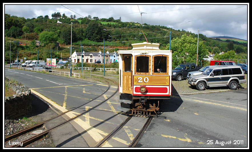 MER Car No 20 heads over the last of three level crossings leaving the station en-route for Ramsey