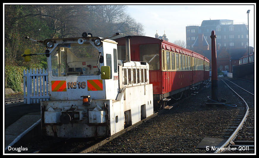 Diesel loco No 18 'Ailsa' stands at the head of three saloon coaches