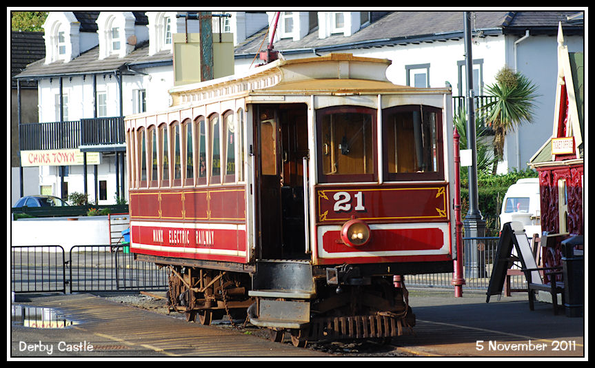 Car No 21 stands in the MER station, ready to head off for Laxey and Ramsey