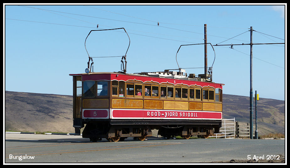 Snaefell Car No 5 crosses the Mountain Road and enters Bungalow station