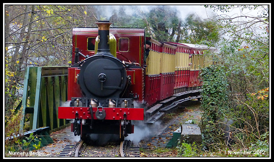 'Kissack' rattles across the Nunnery Bridge over the Douglas river with the 09:50 to Port Erin
