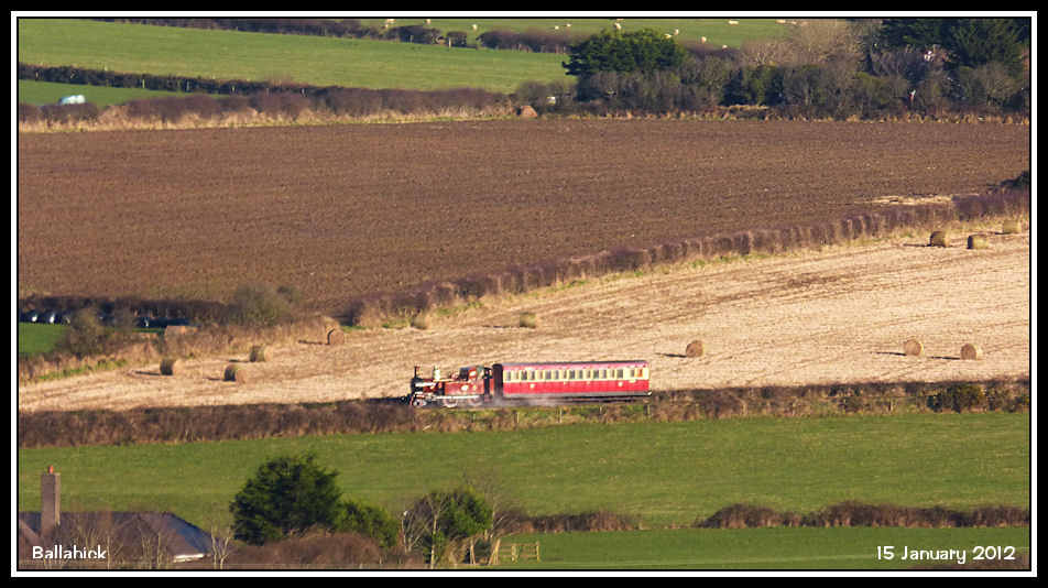 Pictured from the control tower at Ronaldsway Airport, No 4 'Loch' drifts into Ballasalla with a single coach train