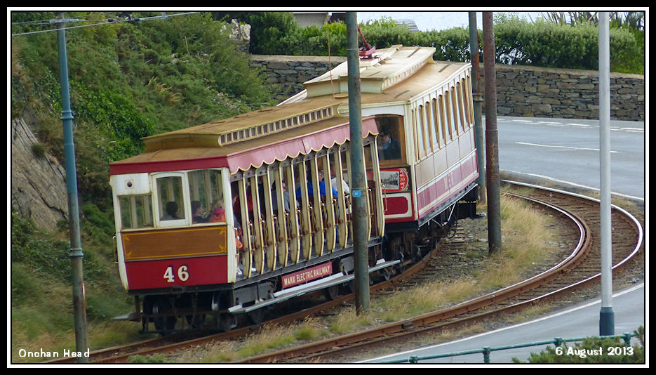 Car No 20 with trailer No 46 screech around the tight curve on Onchan Head