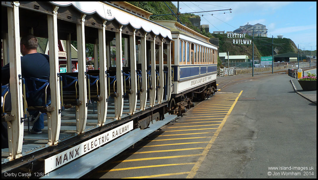 Blue liveried Car No 7 with matching trailer No 48 stand at the Douglas terminus of the MER