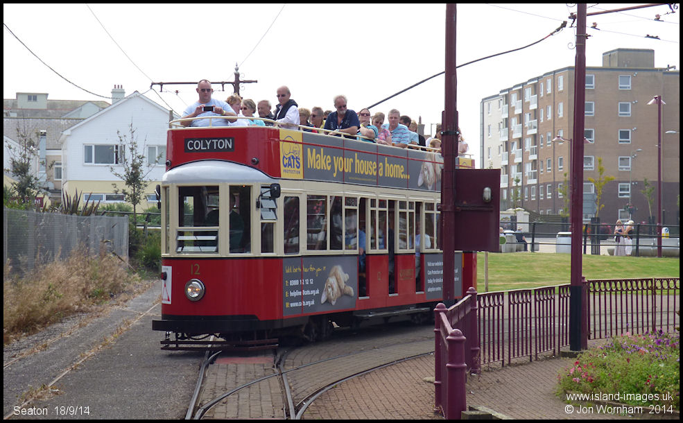 Tram No 12 leaves the Seaton terminus heading for Colyton
