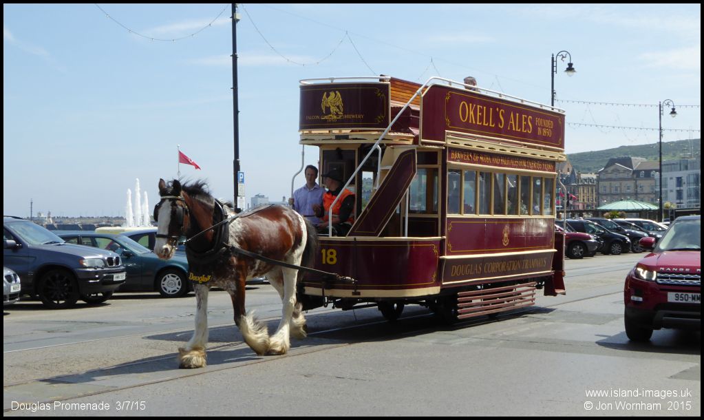 Double deck horse tram No 18, out for an excursion along the prom pulled by Douglas