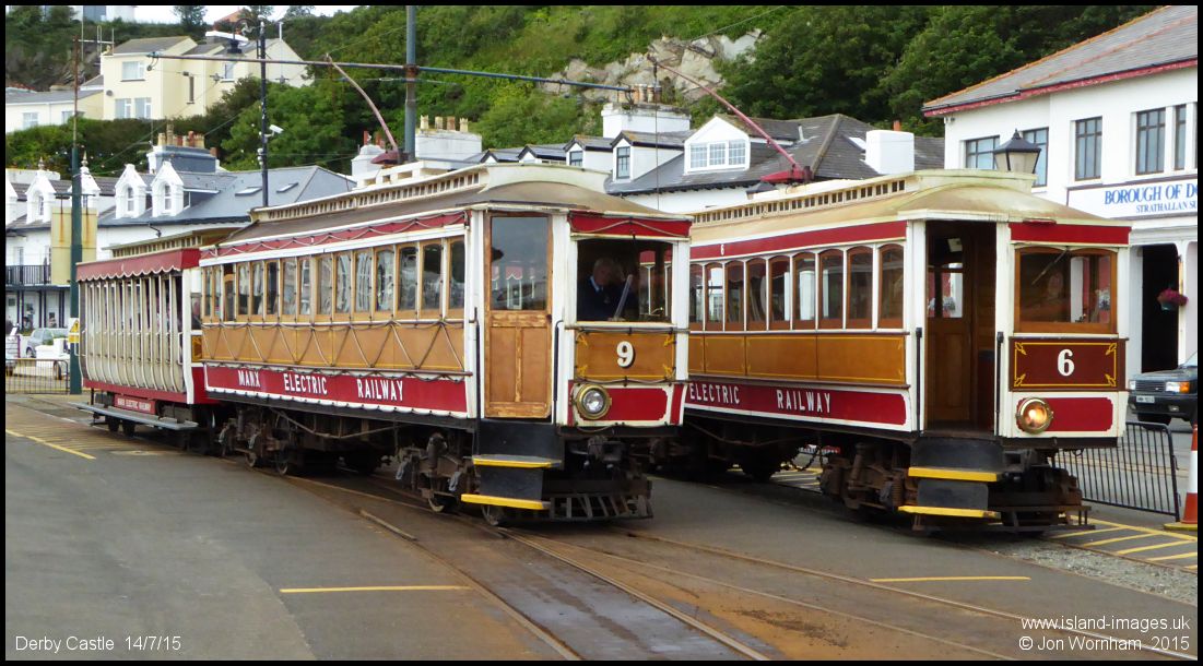 Car No 9 heads off with the 12:40 to Ramsey, passing No 6 stabled in the siding
