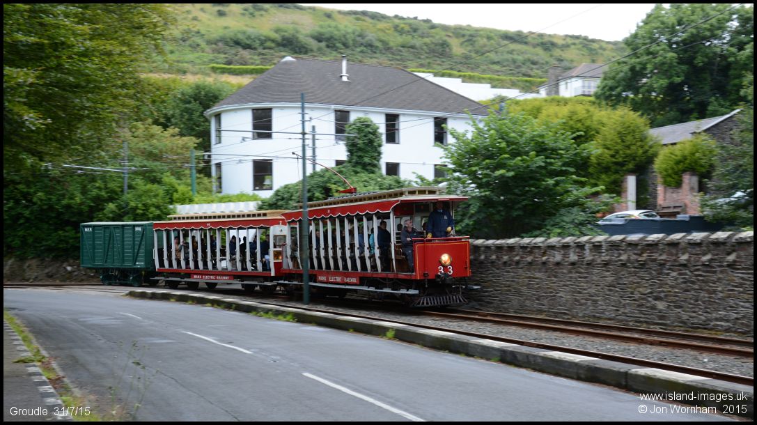 Car No 33 on the very tight curve where the MER and road cross Groudle Glen on a high viaduct