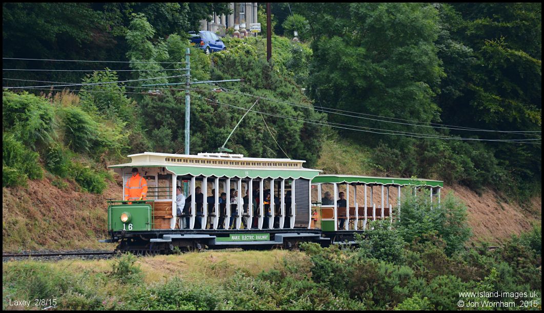 Green liveried Car No 16 heads down the hill arriving from Ramsey