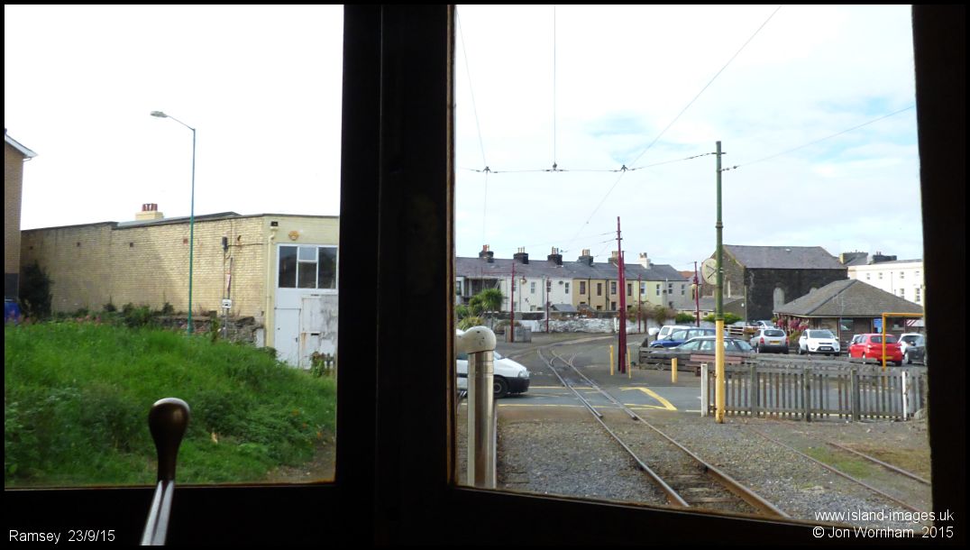 Arrving at Ramsey, where 'white van man' is determined to shave seconds off his journey by crossing in front of the tram!