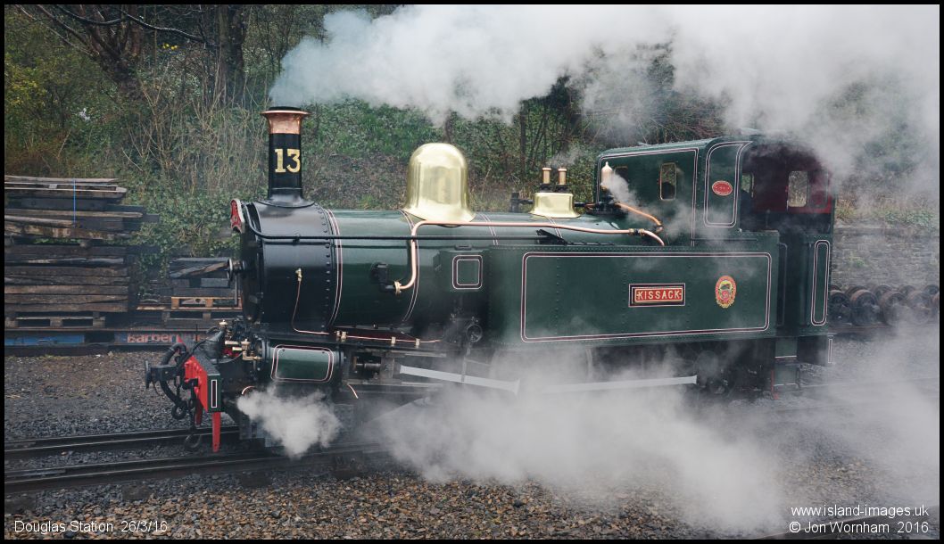 Smoke and steam from No 13 'Kissack', looking very smart in a new coat of dark green paint